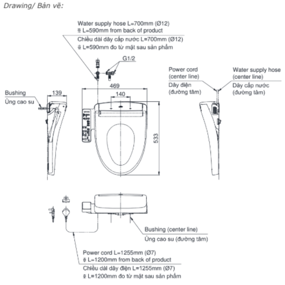 Bản vẽ kích thước nắp bồn cầu Washlet Toto TCF33461GAA